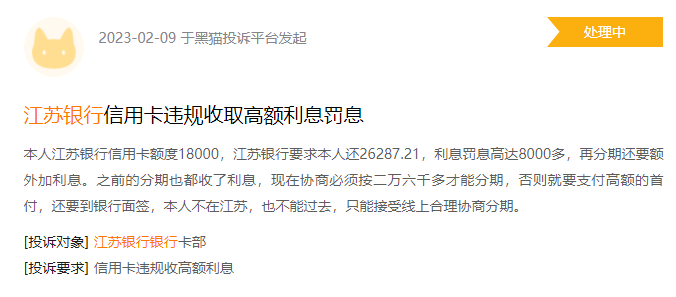 信用卡违规收取高额利息罚息位居投诉前列。一位用户在黑猫投诉平台上反映,江苏银行信用卡额度18000,江苏银行要求还26287.21,利息罚息高达8000多,再分期还要额外加利息。之前的几个月月也都收了利息,现在协商必须技二万六干多才能分期,否则就要支付高额的首付,还要到银行面签。