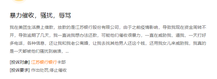 暴力催收也是投诉重灾区,有用户反映,在美团生活费上借款,放款是江苏银行,逾期几天,一直打电话发信息威胁自己和家人,还了一个号码还是继续发短信,对自己和家人的生活造成严重影响。