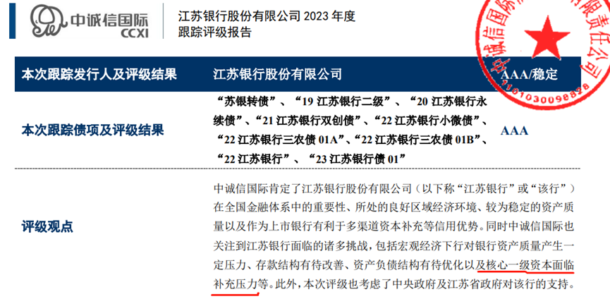 来源:中诚信国际《江苏银行股份有限公司2023年度跟踪评级报告》