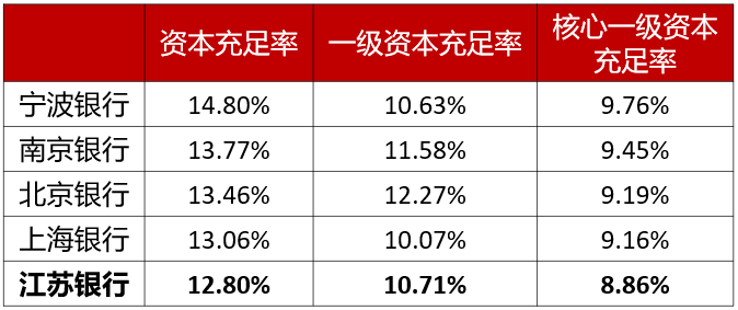 同行对比下,江苏银行的资本充足率明显低于其他几家大城商行,在17家城商行中也排名倒数。
