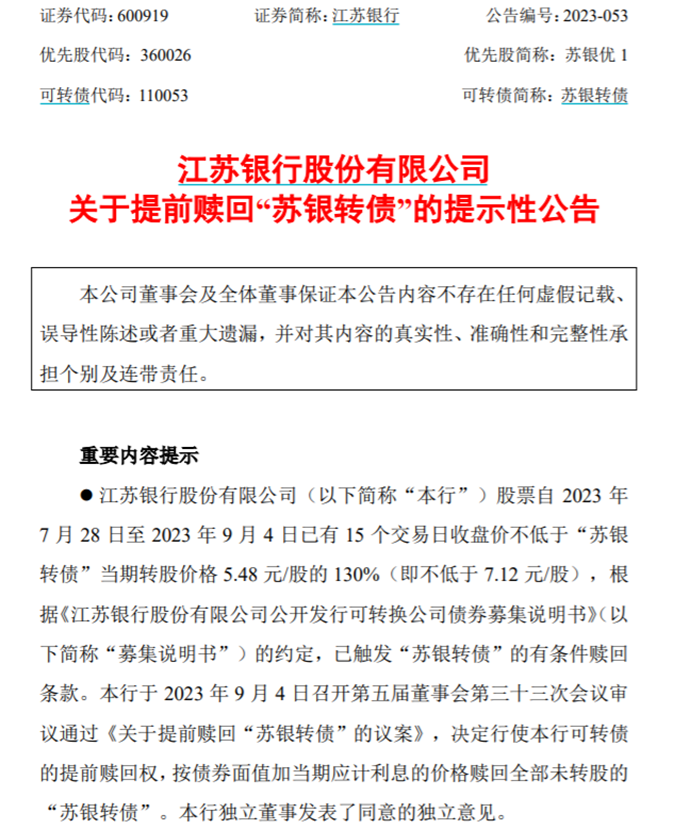 江苏银行发布公告提前赎回可转债,来源:江苏银行公告