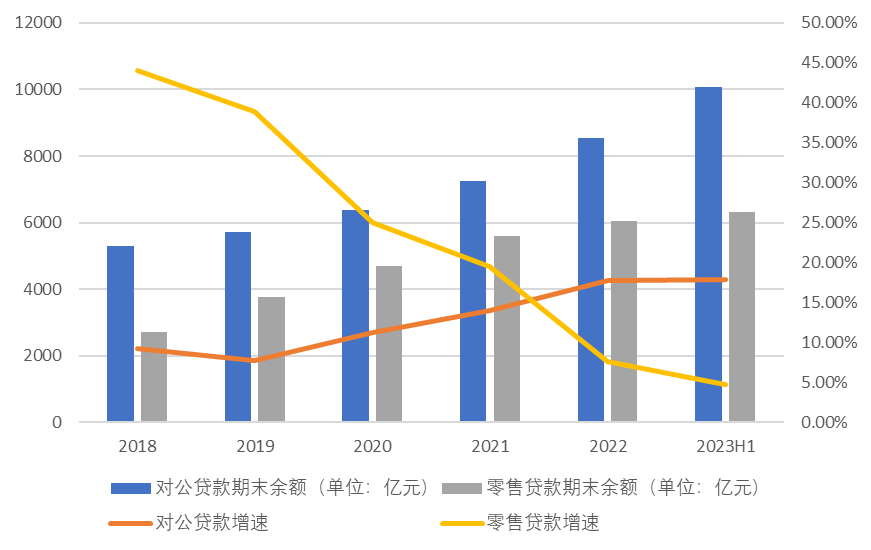 2018年至2023年上半年江苏银行对公贷款和零售贷款余额及其增速