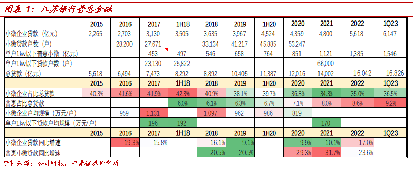 1、全口径小微来看,规模突破6000亿,近五年基本维持10%以上增速,科创服务领先。1Q23小微贷款规模突破6000亿达6147亿,常年基本维持10%以上的增速,2022年小微贷款在高基数的基础上继续同比高增17%。户均方面,根据2020年披露的数据测算,户均在820万左右,近年来随着普惠发力,户均金额有所降低。经营策略方面,线下为主,中小客群是公司历史以来的优势强项,早在2015年江苏银行这类客户的贷款规模占比就超40%,小微贷款在江苏省内市场份额稳居第1位。特别是科创企业,在2021年就实现省内高科技企业“三分之一有合作、六分之一有贷款”,专精特新企业“二分之一有服务、四分之一有授信”的目标,2022年实现专精特新企业服务覆盖面提升至三分之二,授信覆盖三分之一,科技贷款余额保持省内第1位。