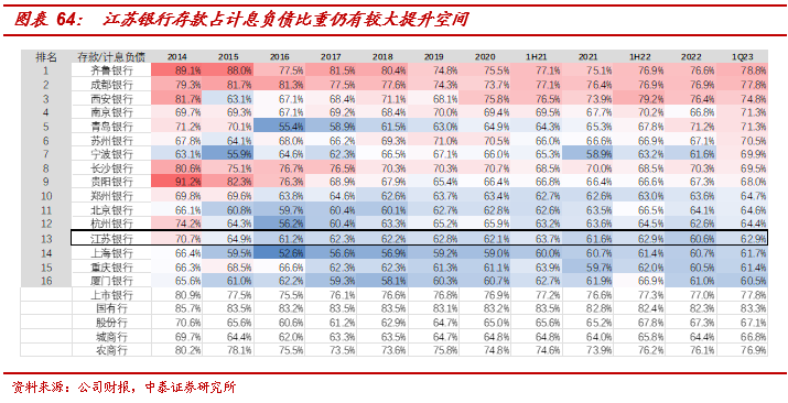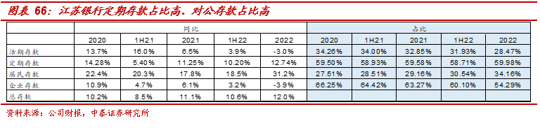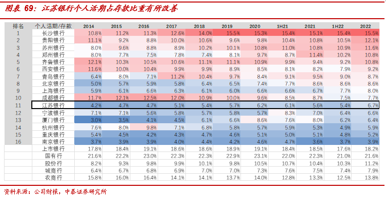 存款中,对公存款占比高,个人定期增速快,个人活期彰显改善趋势。公私角度来看,企业存款一直维持60%以上的占比,直到2022年末占比降至54.3%,与行业整体趋势一致,主要由于疫情下企业生产经营恢复需要时间,叠加财政支出规模较大,导致公司和财政存款压力均较大;而个人端避险情绪高涨,个人定期化趋势延续,自2019年以来维持20%以上的高增速。定活角度来看,定期占比高且增速快,截至2022年末,活期存款占比总存款28.5%,定期存款占比60%。但在2022年下半年个人活期有所发力,实现同比高增33%,个人活期占比也提升至近五年来的最高值6.7%。截至2022年末企业活期占比和个人活期占比在城商行分别位于第14位和第11位,均有较大提升空间。零售方面(下文将展开具体分析),得益于客户规模和理财业务优势,财富管理的增长潜力有望带动存款规模;对公方面,合并前,10家城商行已经完成了当地存量财政存款的分配,而新增财政存款的分配是渐进式的,下阶段增量财政存款有望向江苏银行倾斜。
