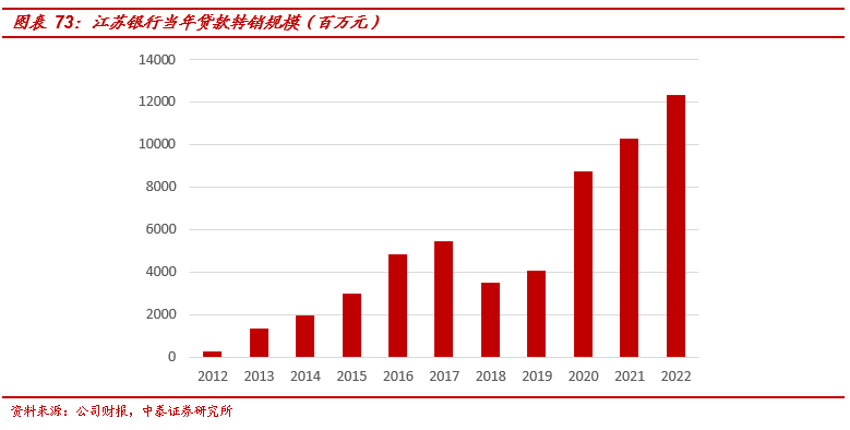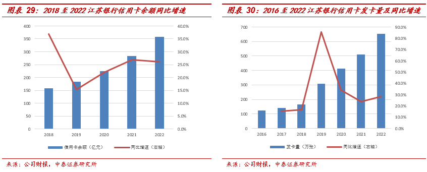 (2)信用卡业务:江苏银行近年来通过合作模式实现弯道超车,近三年信用卡贷款余额维持20%以上的高增速,23年上半年消费交易额同比增15%。一是通过与美团等头部互联网平台合作获客,发卡量维持较快增速,截至2022年,信用卡发卡量达到653万张,信用卡贷款余额358亿,近五年同比增速基本维持在20%以上(除2019年外,2019年同比增速为15%)。二是在今年消费复苏不及预期的宏观背景下,江苏银行信用卡上半年实现消费交易额近300亿元,实现同比增15%,其中线上消费额同比增长超33%。包括与特斯拉、蔚来、极氪、小鹏、比亚迪等新能源汽车头部企业联动让利;针对新市民发行的数字“e融卡”累计发卡上半年已突破15.9万张;通过持续多年的“5动全城”信用卡品牌活动发力线上线下一体化消费场景。