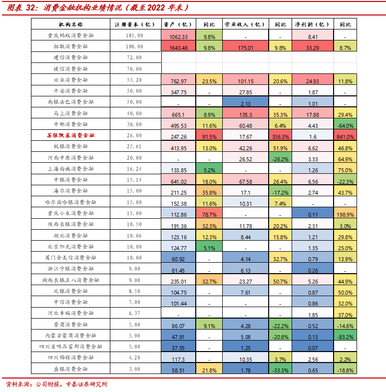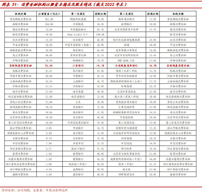 (3)消金公司:苏银凯基消费金融不受地域限制,完善江苏银行消金版图,继2021年开业首年实现盈利后,2022年业务全面飞跃,截至今年6月28日贷款余额较年初增31%。股东优质,资本充足:苏银凯基消费金融有限公司是由江苏银行、台湾凯基商业银行、海澜之家以及五星控股四家股东联合发起设立的持牌消费金融机构,注册资本26亿,位列消金公司第9位,是城商行参控股消金中注册资金规模最大的消金公司,资本较为雄厚。其中江苏银行、台湾凯基商业银行、海澜之家、五星控股分别出资54.25%、36.17%、7.5%、2.08%。战略方面,1+4+N,全国布局,完善江苏银行消金版图:紧密围绕“1+4+N”经营战略,构建具有苏银消金特色的差异化业务发展模式,“1”指的是自主经营阵地;“4”指的是整合4个股东方生态资源,为其提供流量等服务;“N”指的是接入多个线上平台并提供消费贷服务,苏银消金已接入蚂蚁、京东、小米等头部平台。消金公司不受经营地域限制,可全国放贷,与母行错位经营,对客综合定价在24%以内,更偏向长尾客群,是江苏银行完善消金版图的重要一步。业绩表现方面,2022年业绩实现跨越发展,2023年维持贷款规模高增:苏银凯基2021年3月开业,首年盈利0.17亿,起步稳健;2022年末,苏银消金实现贷款余额229.64亿元,占整个江苏银行消费信贷的8%;资产规模达247.3亿,位列第9位,发展迅速;营收17.67亿,位列第10位,净利润1.6亿,位列第15位,较2021年同比高增841%,实现跨越发展,但净利润规模仍位列中游,相较资产和营收排名较低,可见公司在2022年整体仍处在前期投入期。据公司公告,截至2023年6月28日,贷款余额突破300亿元大关,较年初已增长31%,累计服务全国客户超500万户,2023年仍维持较高规模增速。