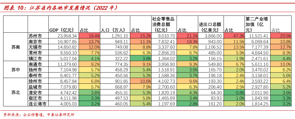 省内格局:“十三太保”整体实力均较强,苏北在全国范围内也不弱。在江苏省内部,苏北苏中和苏南地区之间也有一定差异,不过在国内整体发展水平均较强。江苏省内部共有13个地级市,整体来看,苏南地区经济更为发达,其中苏州、南京和无锡合计占了江苏省GDP、人口、社零、进出口值和第二产业增加值的40%以上。而苏南的镇江和苏北地区淮安、宿迁、连云港相对来说发展较弱一点。不过尽管如此,即使是GDP最低的连云港市也能在2022年中国城市GDP百强榜中排名前80,江苏“十三太保”整体实力均较强。