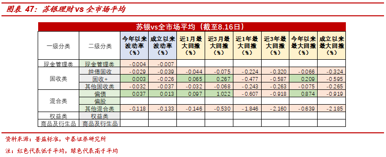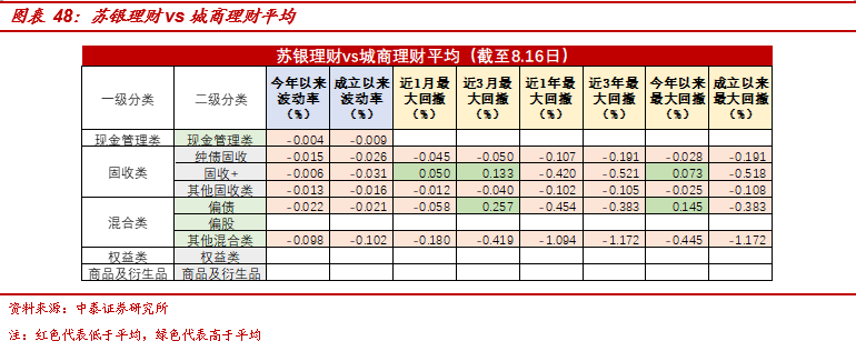 质量:回撤控制优秀,净值波动稳健。一是内部各类产品中,现金管理、纯债固收波动率相对较小,今年以来纯债固收波动率仅为0.03%,各期限维度的回撤也相对较低,纯债固收近一年最大回撤为0.53%,今年以来最大回撤明显好转,仅为0.06%。二是同业对比方面,多数产品回撤优于同业,在近一年最大回撤角度观察,各类产品基本均优于同业,纯债固收、固收+、偏债固收、其他混合类相比全市场公募理财平均水平分别低22bp、48bp、60bp、185bp。较城商行理财子公募理财平均水平低11bp、42bp、45bp、109bp。