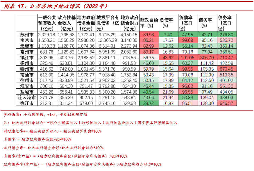 从2022年江苏省各地级市财政数据来看,整体呈现“南强北弱”格局,城投平台债务较大。苏南地区除镇江市外政府债务偿还能力强于苏中和苏北地区,而且各市考虑城投平台有息债务之后的宽口径债务率显著高于普通债务率,显示出江苏省内城投平台债务较大。苏州市、常州市和无锡市政府债务率相对较低,偿债能力较强。而苏北地区政府综合财力相对苏南较弱,政府负债率及债务率相对较高,城投平台债务负担重,财政自给率相对较低。在考虑城投平台有息债务之后,从债务率来看,连云港徐州盐城淮安宿迁。