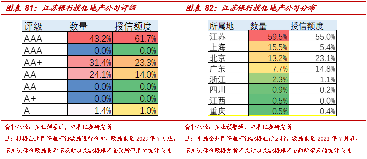 根据企业预警通可得数据来看,江苏银行表内授信房地产公司主要为央国企。评级方面来看:AA级及以上地产公司占99%,其中AAA级占43.2%,授信额度占61.7%,AA+占31.4%,授信额度占23.3%。地域分布来看,主要还是分布在江苏、上海、北京、广东、浙江五地,五地地产公司数量占98%,授信额度占99%。