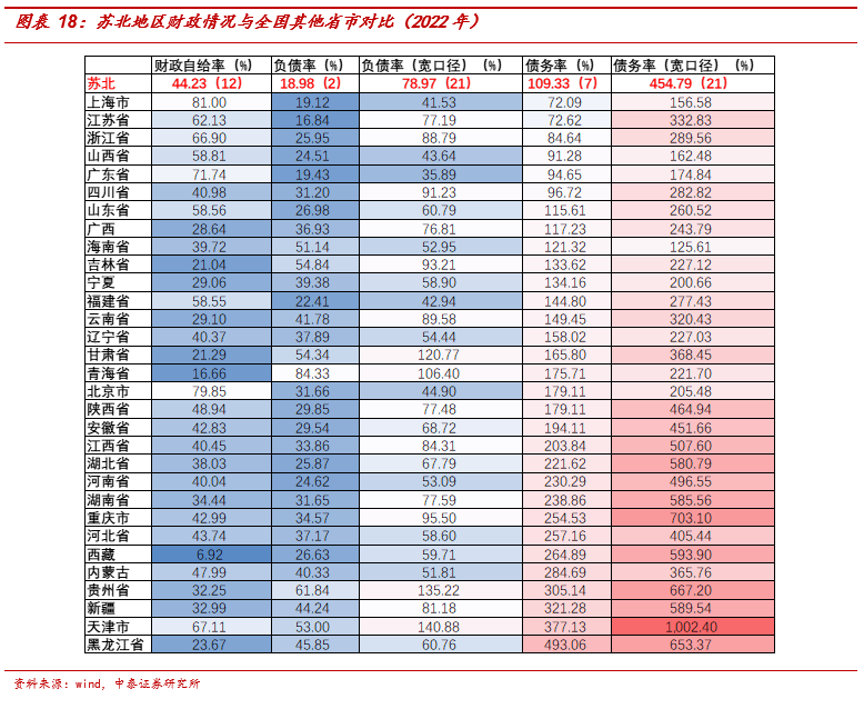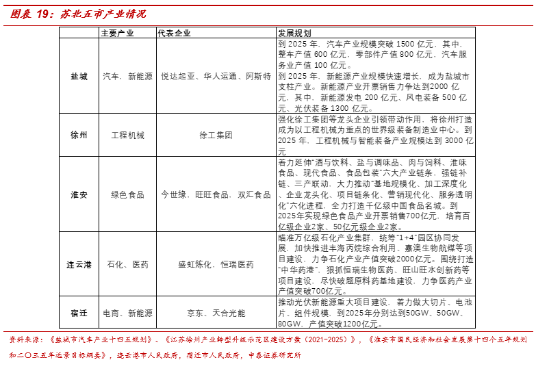 苏北地区本身有一定产业支撑。徐州以徐工为龙头,是全国工程机械产品类别、产品品种最齐全的地区之一;盐城不仅有起亚、华人运通等整车生产企业,还在重点打造晶硅光伏、风电装备两条新能源产业链;连云港有盛虹炼化为代表的石化企业和恒瑞医药为代表的新医药产业;淮安拥有双汇、苏食、旺旺、今世缘酒业、苏盐井神等绿色食品骨干企业;宿迁有以京东为代表的电商产业以及天合光能为代表的光伏产业。因此有了产业支撑,苏北地区的偿债能力相较于过度依赖土地财政的地区来说偿债能力相对更强。