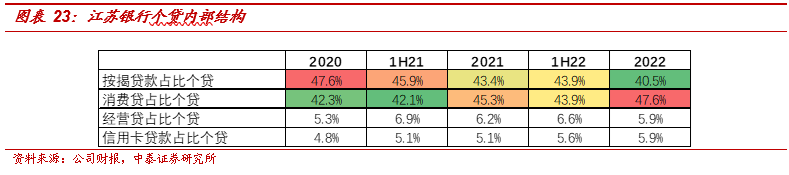 1H22个贷占比环比下滑,而后消费贷发力带动2022年末个贷占比有所回升,2022年末个贷占比位列上市城商行第三,近年来占比提升速度处同业领先。过去五年,江苏银行个贷占比提升6个点,受消费贷和按揭共同拖累,1H22个贷占比相较2021年末下降3.8个点,其中消费贷和按揭占比总贷款分别下降2.2个点和1.4个点,而后得益于消费贷款发力,截至2022年末消费贷占比回升1.9个点,带动个贷占比总贷款回升1.4个点。内部结构来看,按揭贷款占比个贷呈下降趋势,由2020年的47.6%下降至2022年末的40.5%,而消费贷占比个贷由2020年的42.3%提升至2022年末的47.6%。同业来看,自2018年开始,江苏银行个贷占比总贷款一直高于城商行平均水平,2022年末高出4.3个点。
