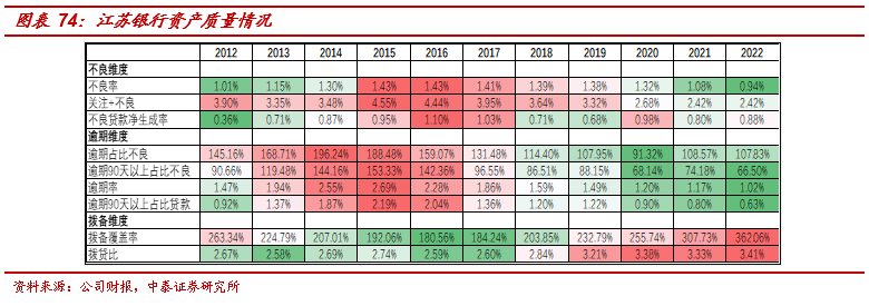 (1)不良率、逾期率达上市新低。2013-2015 年,受宏观经济下行和外需不振影响,江苏省原支柱产业钢贸、光伏、航运风险有所暴露,公司资产质量受到负面冲击,2015 年末公司不良率+关注率一度逼近5%。2015 年后公司明显加大了不良资产的认定和处置力度,资产质量表现也逐步得到改善,不良+关注占总贷款比重连续6 年改善。不良率自2017年后维持下降趋势,截至1Q23不良率为0.92%。2022年逾期率仅为1.02%,不良率逾期率均达上市以来新低。(2)加大对不良的认定:领先同业早在2017年就将逾期90天以上贷款全部认定为不良,对不良认定力度持续加严。江苏银行自2015年就加大了不良的认定力度,在2017年领先于同业将全部逾期90天以上贷款认定为不良,且90天以上逾期/不良呈下降趋势,2022年达上市以来新低66.5%。(3)加大不良处置力度:近三年核销规模逐年稳步上升,核销规模的上升不是因为资产质量下行,而是江苏银行近三年一直维持较高且平稳的资产增速,在高基数的基础上仍能基本维持高于城商行平均、股份行平均的增速水平,在较高的资产增速下,2022年不良生成率0.88%,较2020年高点降低10bp,核销规模抬升是公司主动加大不良处置力度的合理路径。(4)安全边际逐渐提升。随着公司不良压力减小,同时拨备计提持续夯实,公司整体安全边际不断提升,2022年拨备覆盖率、拨贷比均达上市以来最优水平。