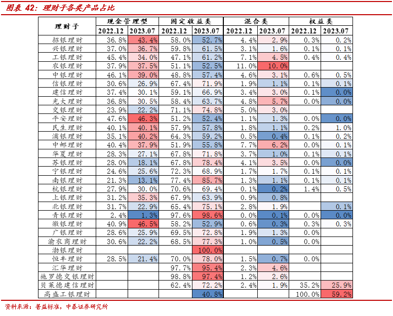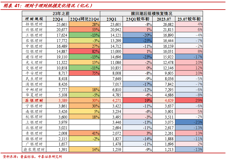 规模:苏银理财在赎回潮后规模恢复速度领先全市场,绝对规模稳居城商理财第一。苏银理财注重产品定位,资产组合充分考虑产品流动性、收益性、安全性,突出久期管理,去年11月份债市开始调整前已开始缩短产品久期,提高流动性比例,在一定程度上减少了产品回撤幅度,并通过分散化配置严控个券的集中度,防范单一债券对组合的过度影响。根据普益标准数据,截至23Q1,在管理规模在1000亿以上的理财子公司中,苏银理财在赎回潮后规模恢复最快,较年初增长19%至4271亿,位列理财子公司首位。截至2023年7月末,苏银理财规模在4629亿左右,相比年初规模增29%,继续位居首位,是唯一一家规模较年初增长超20%的理财子公司,也是唯一一家管理规模超过四千亿的城商理财子,匹配其零售客户规模。产品类型方面,年初以来,苏银理财增加了固收类的配置,而现金管理类、混合类有所压降,现金管理、固收、混合分别占18.1%、78.4%、3.5%,较年初占比分别变化9.9%、10.6%、-0.6%,现金管理类符合行业整体趋势。