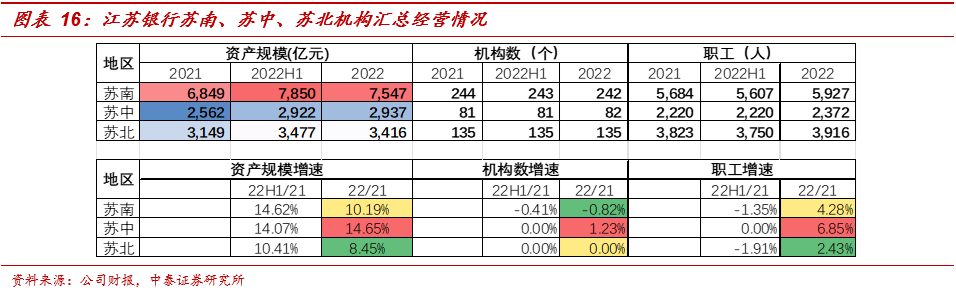 单从江苏银行2022资产扩张和员工增配幅度来看,均是苏中苏南苏北,体现了江苏银行加强苏南苏中市占率的策略。资产扩张复苏来看,苏北、苏南、苏中分别为14.7%、10.2%、8.5%,苏中三家分行均实现10%+的资产增速,南通、泰州、扬州分别为17%、12.5%、12%;苏南主要是常州、镇江、苏州,同比增速分别为15.7%、14.6%、13.2%;苏北主要是宿迁和盐城,同比增速分别为15%和13%。在员工配置上,苏中、苏南、苏北分别同比+6.85%、4.28%、2.43%,苏中主要是泰州和南通员工增加较多,苏南主要是南京、常州、苏州,同比增速均为4.5%以上。