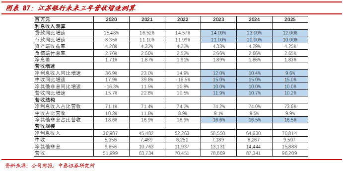 江苏银行客户规模和理财综合实力具有明显优势,且2023年规模回升速度行业最快;另外财富管理业务其实天然就具有规模壁垒,一定规模数量的客户,公司的投研能力和服务客户的体系都是必不可少的,因此只有大中型银行才更有可能参与这个新赛道的竞争。江苏银行资金端仍在发力期,作为头部城商行是有这个潜力脱颖而出的。假设中收24-25增速均为15%。