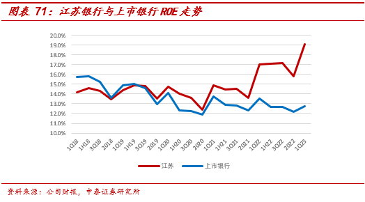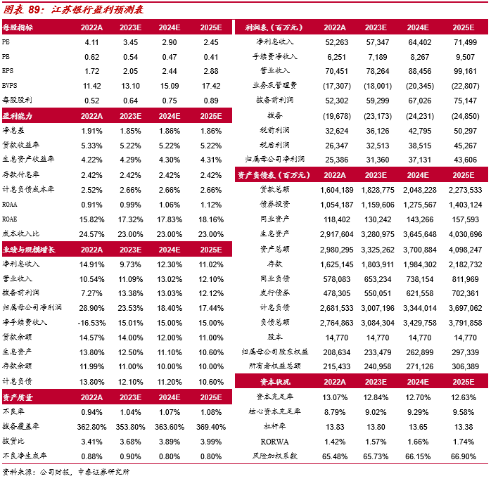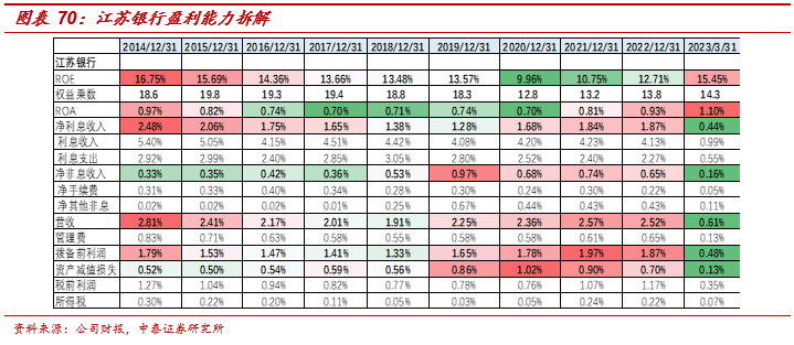 对江苏银行未来3年净利润增速进行测算:伴随着资产质量的改善,预计有释放利润的空间:根据江苏银行披露的2023年中报,公司不良率为上市以来最低,安全边际进一步提升。2Q23不良率环比下降1BP至0.91%,较年初下降3bp,实现上市七年来不良率的持续优化,目前为上市以来最优水平。拨备覆盖率环比提升12.4个点至378.09%,安全边际进一步提升,自2020年末以来维持季度环比提升趋势。公司对不良一直是严谨稳健的态度,过去拨备支出对不良生成覆盖是持续处于盈余的。预计随着未来不良生成稳定在低位,公司的信用成本可以边际少提,进而有释放利润的空间,预计2023-2025年ROE分别可达17.32%、17.83%、18.16%。