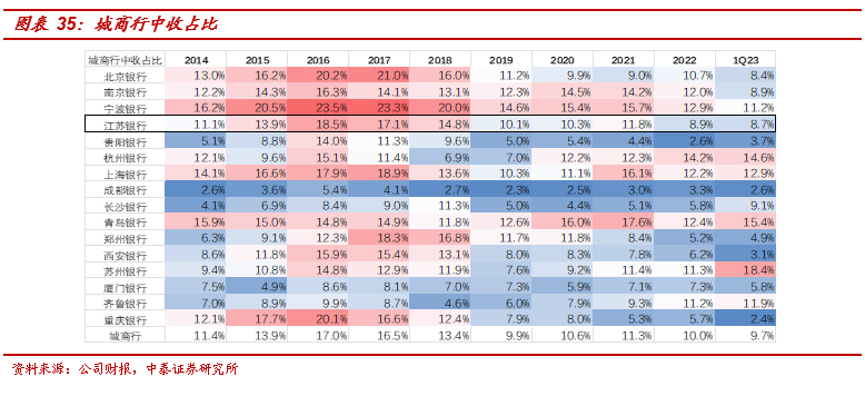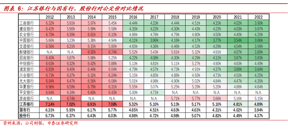 小微优势贡献较高的对公贷款收益,江苏银行对公端贷款定价高于大行平均和股份行平均。江苏银行22年对公端贷款利率仅次于浙商银行,一定程度上反映出公司在小微业务经营上的护城河。议价能力背后体现的一个是客群的选择,一个是客户的服务,这两者最终呈现的就是公司在客户端的综合竞争力(不与城商行比较的原因在于区域金融竞争情况不同,银行对企业的定价水平难以统一比较)。