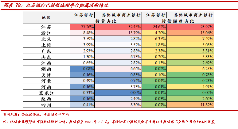 平台归属省份来看,苏浙北上广占96%,省内平台占八成。江苏银行在江苏、浙江、北京、上海、广东授信平台数量占其总授信数量的96%,近八成表内授信平台位于江苏省,其授信额度占比为85%;其次是浙江平台数量占8.5%,授信额度为4.2%。另外,平台中归属于上海和广东的数量占比也超过城商行平均。