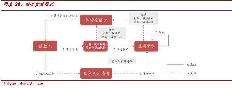 江苏银行互联网合作贷款多为头部互联网平台,以无增信缓释的助贷分润为主,自主风控经历周期检验。互联网合作贷款类型:通常来看,按照出资比例,互联网合作贷款可以分为联合贷款和助贷,联合贷款多为双方共同出资(银行最高出资比例为70%),各自承担其出资部分的风险。助贷多为资金方100%出资,在助贷模式下又可分为增信模式和分润模式,在增信模式下,助贷机构通过自有增信公司(多为融资担保公司)或者外部增信公司(融担公司或保险公司),为资金方发放的全部或者部分贷款进行增信兜底。其中,增信模式下,银行收益多为固定收益,违约风险转移至表外,由增信机构处置。分润模式下,银行收取利息收入后,再向合作公司进行科技服务费等费用的分配,风险自担,对自主风控能力要求更高。江苏银行合作贷款主要为助贷分润模式,自主风控能力经过周期检验。联合贷款方面,受监管限制,联合贷款占江苏银行作贷款比重相对较小,且江苏银行在经营策略上主动维持联合贷款规模稳定。助贷方面,自开展互联网合作贷款以来,江苏银行就重点发力助贷模式,且多为无风险缓释的分润模式,更多强调提升自主风控能力,多年来形成了较为强大的风控能力;当然在经济波动下也适当增加助贷增信模式,在自主风控严格把控的基础上,又多了一道增信保障,风险更为可控,抗周期性更强。