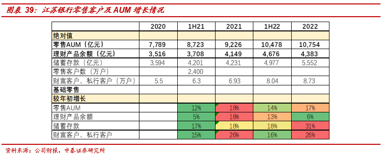 基础零售客群规模超过2500万,仅次于北京银行,高规模提供更高的财富管理天花板。江苏银行仅在1H21和2022财报中披露其基础零售客户数,2022其零售客户数超过2500万户(不含互联网业务获客),客户总数仅次于北京银行,相较1H21增加100万户。