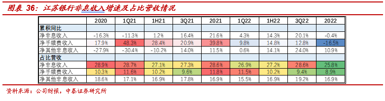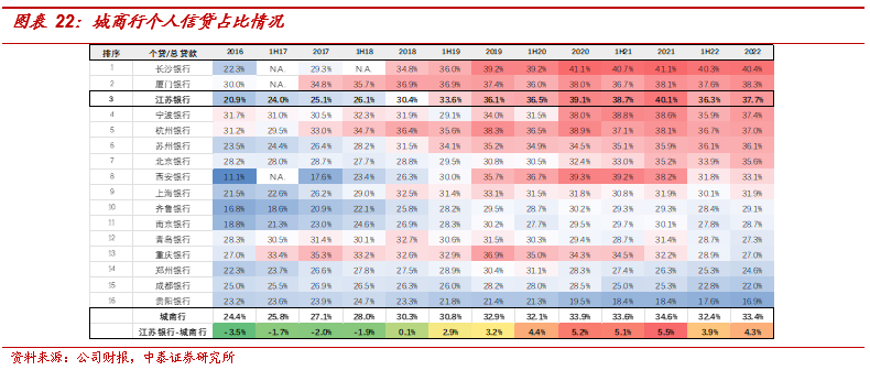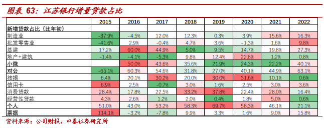 如前文所述,无论存量还是增量来看,零售、小微、基建、制造业一直是江苏银行信贷重点及特色。(1)存量贷款结构来看,零售端,2022年末零售类贷款占比为37.7%,在上市城商行中仅次于长沙和厦门银行。在零售贷款中消费贷占比目前最高(17.9%),其次是按揭贷款(15.3%)。对公端,从行业角度来看,基建(21.3%)和制造业(12.1%)是主要组成部分,从客户角度来看,小微企业贷款占比较高,达到了36.5%。(2)增量贷款结构来看,零售端,除了2022年受疫情影响比较特殊以外,每年相较年初新增的贷款中零售类贷款都基本上占50%以上,而零售端消费类贷款新增占比一直较高,基本上每年都保持总贷款25%左右的占比。对公端,近年来制造业和基建类贷款占比不断提高,而地产和建筑业贷款占比则持续压降,从对公客群维度上说,小微贷款一直保持20%以上的占比,2022年新增占比达到了40.1%。