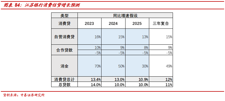 其中,自营消费贷规模相对较小,但自营消费贷规模的提升需要长期的队伍和运营等体系建设,预计增幅不会太高,2023/2024/2025增速分别设为16%,15%,13%;