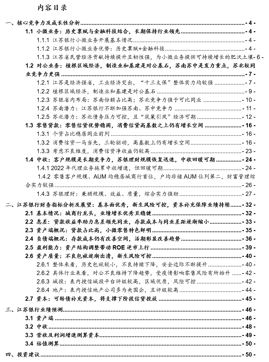 核心要点:我们认为江苏银行核心竞争力有三点:一是小微业务:历史禀赋与金融科技结合;二是对公业务:制造业和基建是对公基石,苏南和苏北均衡发展;三是零售业务:规模优势显现,具备长期竞争力。公司核心竞争力、良好的息差趋势、优质的资产质量和资本补充会保障江苏银行业绩的持续性。
