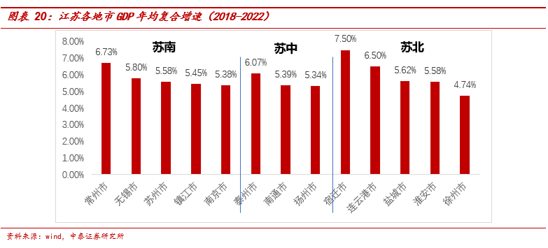 其次,苏北地区近年来经济增长较快,逐步“筑巢引凤”承接省内产业转移,未来也会在江苏扮演更重要的角色。从过去5年的GDP年均复合增速来看,苏北地区除了徐州以外整体增速均较快。主要原因是近年来苏南地区传统的制造业代工模式无法进一步向上升级,省内为了把经济做大做强开始重点发展和扶持苏北地区,投资导向开始向苏北地区转移。苏南“腾笼换鸟”,传统产业转移退出为引进和培育高技术制造业提供空间;苏北“筑巢引凤”,主动接受产业转移和辐射带动,学习先进理念经验,集聚人才、项目和资本,大量的基础制造业和配套办公场地开始进军苏北,极大的促进了苏北地区的经济发展。