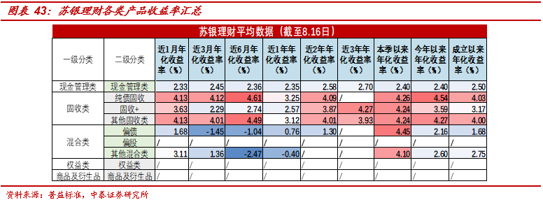 效益:长短期收益率均有不错表现,现金管理类、固收优势明显。一是内部各类产品中,苏银理财纯债固收录得稳定且较高收益,近一年年化收益率在3.25%,今年以来年化收益率在4.54%。二是同业对比方面,近一年年化收益率来看,现金管理类、纯债固收、固收+、偏债混合均跑赢市场,相比全市场公募理财分别跑赢13bp、59bp、33bp、30bp,相比城商行资理财公募理财分别跑赢7bp、50bp、65bp、54bp。