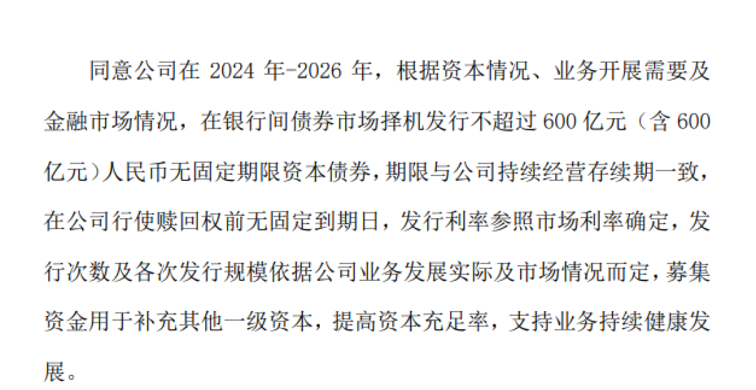 而在2023年12月份,江苏银行发布的董事会决议公告中显示,2024年至2026年,江苏银行计划在银行间债券市场发行不超过600亿元无固定期限资本债券,募集资金用于补充其他一级资本,提高资本充足率。