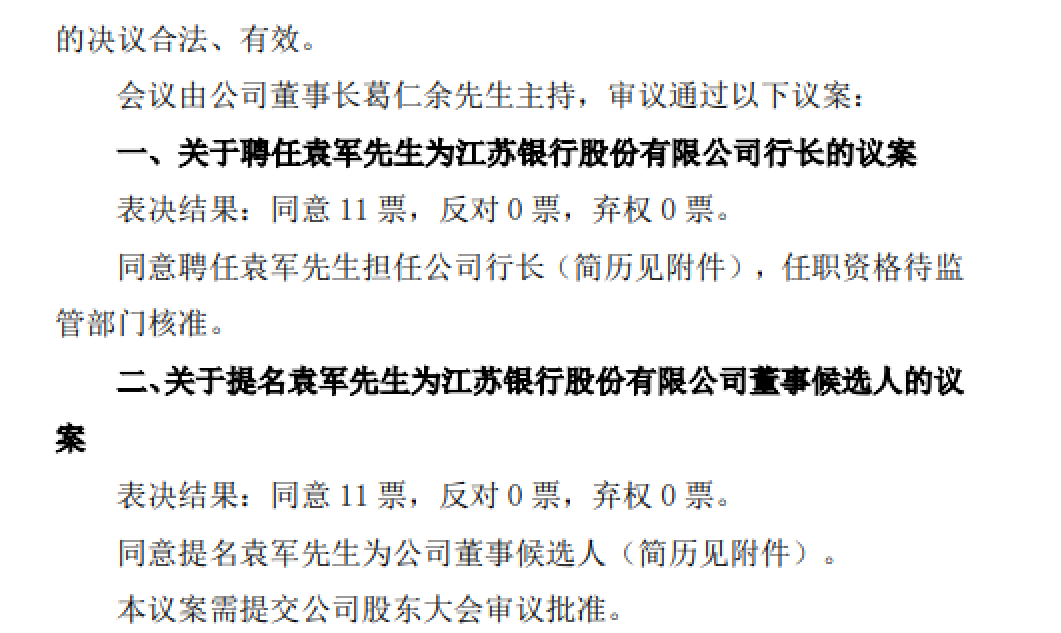 4月15日晚间,江苏银行发布公告称,经董事会会议表决,同意聘任袁军为该行行长,任职资格待监管部门核准。同时,提名袁军为江苏银行公司董事候选人。