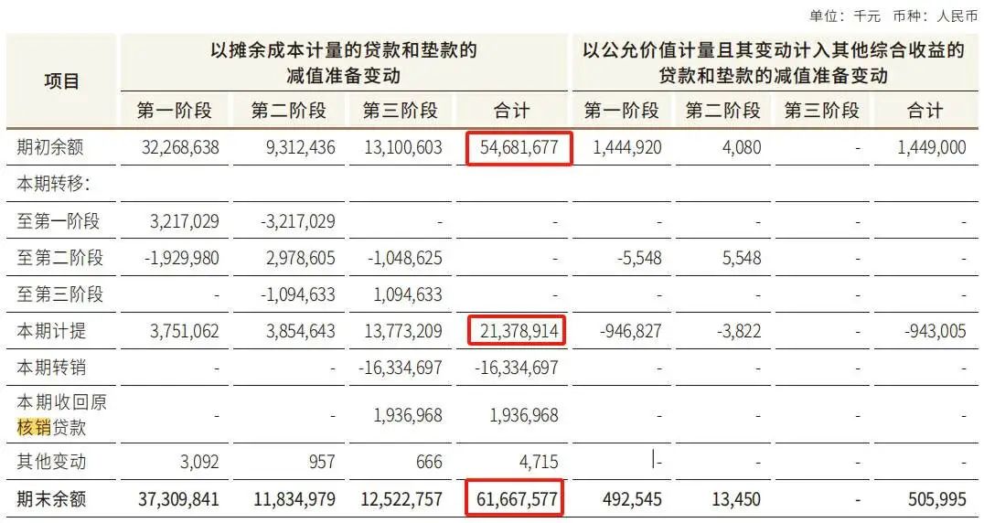 另外,本年度江苏银行在贷款减值准备加大了计提。财报数据显示,期初余额为546.8亿元,期末增加到616.6亿元,其中年度新增计提213.7亿元。