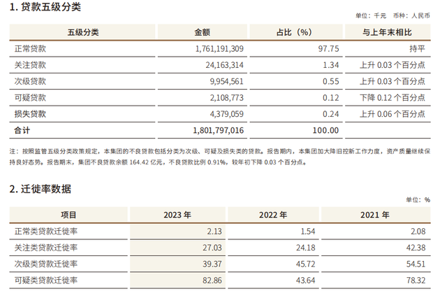 同时,江苏银行2023年末关注贷款241.63亿元,比上年末增加31.7亿元;关注类贷款占发放贷款和垫款总额的比例为1.34%,比上年末扩大0.03个百分点;关注类贷款迁徙率从24.18%上扬到27.03%。