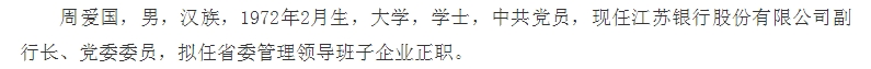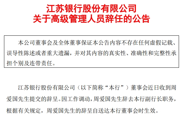 3月20日,江苏银行公告,因工作调动,周爱国于近日辞去该行副行长职务。