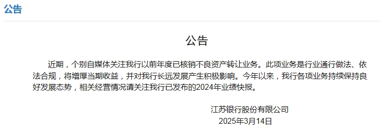 对此,该行公告表示,此项业务是行业通行做法、依法合规,将增厚当期收益,并对长远发展产生积极影响。