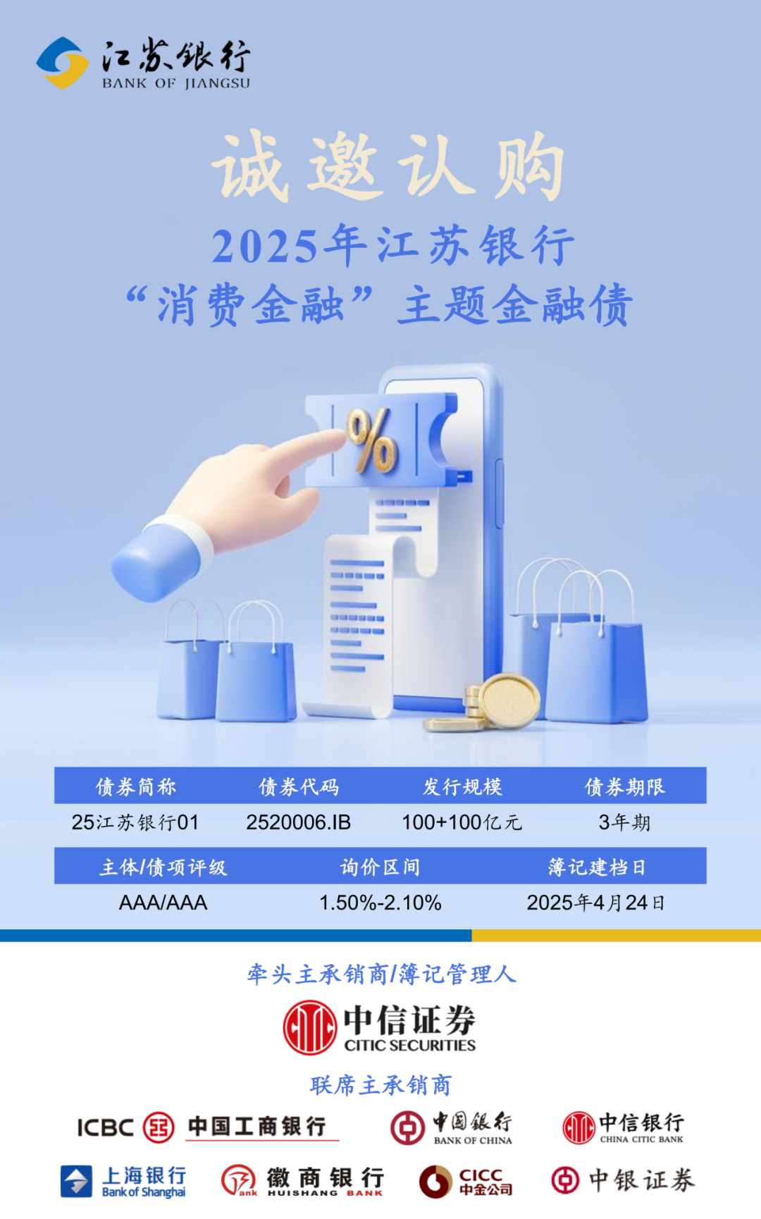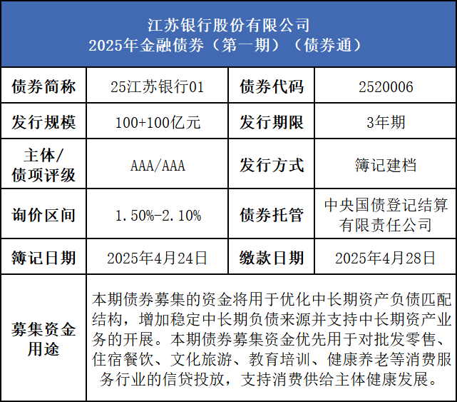 2025年4月24日,江苏银行股份有限公司(以下简称“江苏银行”)将在全国银行间债券市场发行2025年金融债券(第一期)(债券通)。本期债券基本发行规模为人民币100亿元,附不超过人民币100亿元的超额增发权,期限为3年,主体评级AAA,债项评级AAA,托管机构为中央国债登记结算有限责任公司。