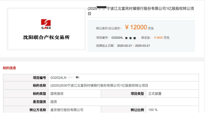 信息显示,宁波江北富民村镇银行成立于2011年,注册资本1亿元。今年2月,宁波江北富民村镇银行100%股权现身沈阳联合产权交易所,转让方为盛京银行,转让底价为1.2亿元。