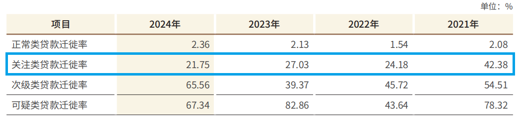但光鲜数字背后暗流涌动。截至2024年末,江苏银行的正常类贷款迁徙率为2.36%,而2023年这一数字为2.13%。意味着该行的优质贷款质量正在下降,信用风险在增加;关注类贷款达到293.60亿元,较2023年末增加51.97亿元,同比增长21.51%;不良贷款为186.85亿元,较2023年末增加22.43亿元,同比增长13.6%。
