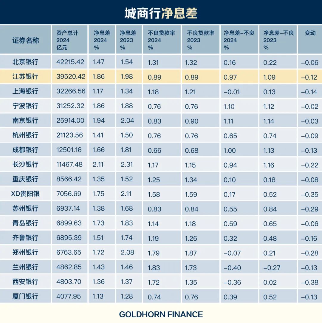 如果我们看2023-2024年的数据,江苏银行虽然净息差数据不错,但经过不良贷款率调整后,其实就一般般。