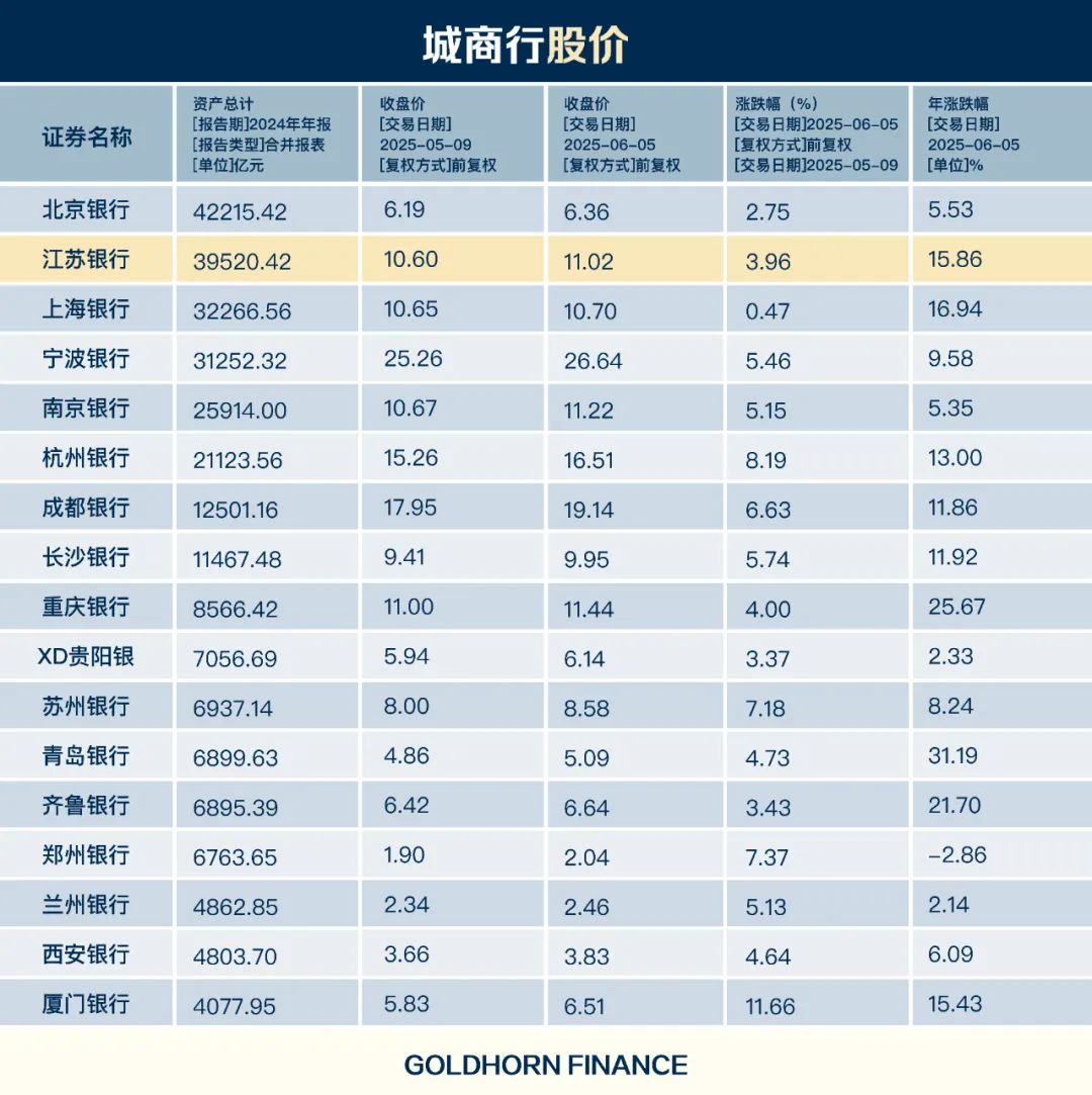 有人说银行股难暴涨,但对比城商行板块,江苏银行的表现确实不算突出。同期,规模3万亿级的宁波银行涨幅超5%,南京银行和杭州银行涨幅分别达到5.15%和8.19%。从全年来看,江苏银行15.86%的涨幅虽然不错,但上海银行涨幅16.94%,城商行板块里还有涨幅超20%甚至30%的银行。