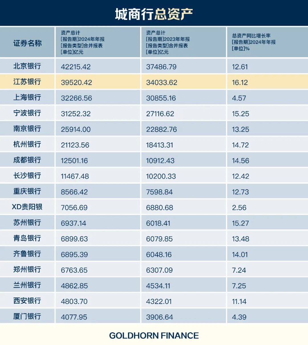 此外,截至2024年末,江苏银行总资产达到了3.95万亿,接近4万亿的水平,也进一步拉近了和北京银行的差距。两者的资产规模差距,由2023年末的超过3400亿元,变为2024年末的约2700亿元。