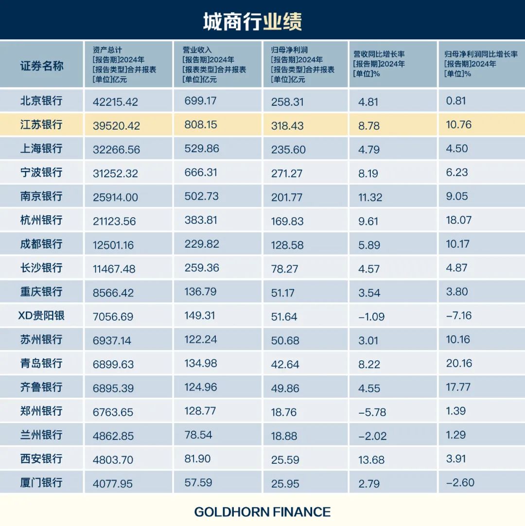 2024年,江苏银行实现营收808亿元、归母净利润318.4亿元,两者都是城商行中最高,甚至比总资产更大的北京银行还领先了一个身位,后者的营收和归母净利润分别为699亿元和258.3亿元。