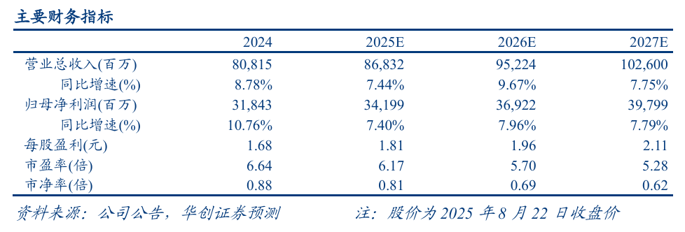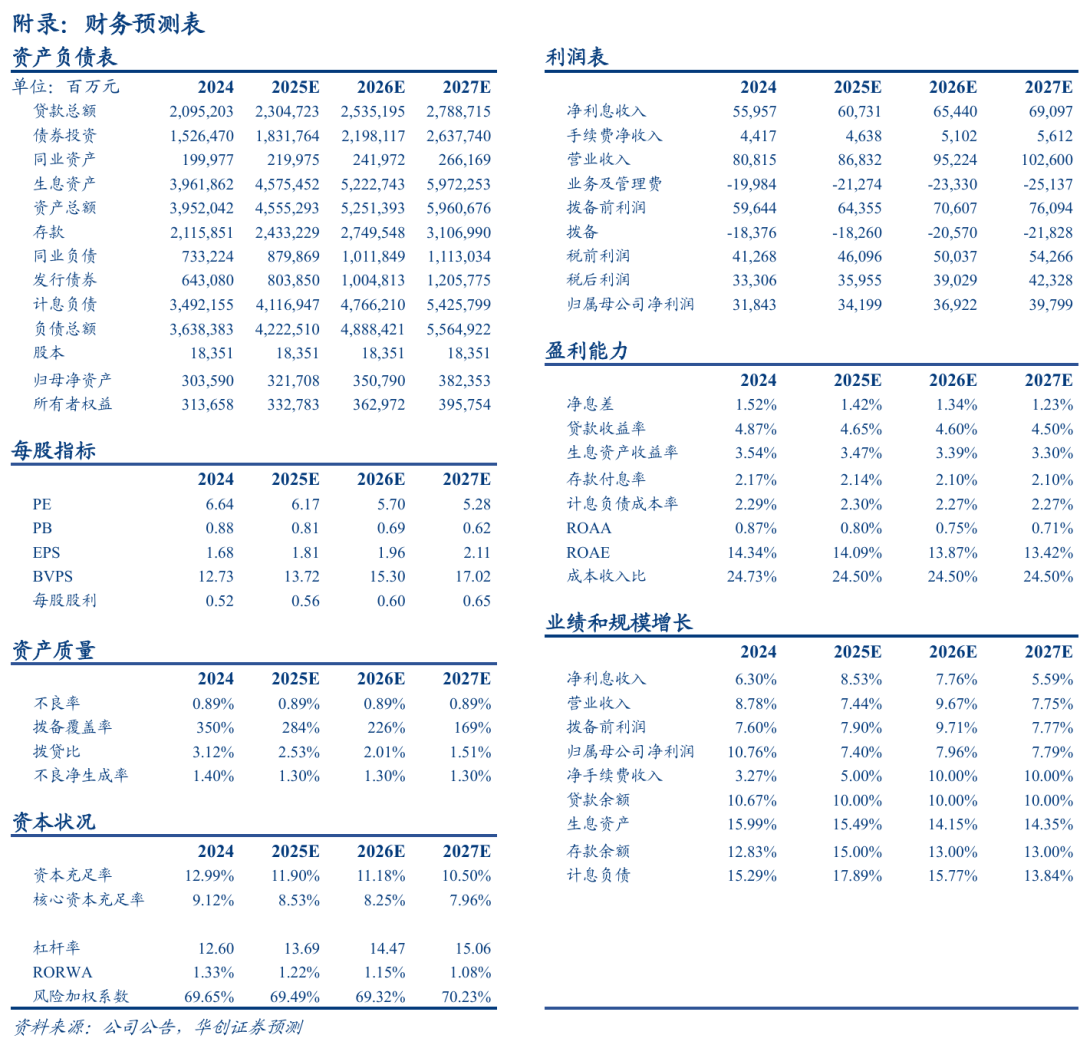 营收增速稳健,负债成本优势凸显,驱动净利息收入高增,利润增长保持韧性。1)25H1营收同比增长7.78%,归母净利润同比增长8.05%,业绩表现稳健。业绩核心驱动力来自净利息收入的强劲增长,上半年净利息收入达329.39亿元,同比大幅增长19.10%,主要得益于公司卓越的负债成本管控能力,利息支出同比下降3.09%,其中吸收存款利息支出同比下降6.40%。2)非息收入则面临一定压力,手续费及佣金净收入同比增长5.15%,保持平稳;但受市场环境影响,公允价值变动录得净损失2.26亿元(去年同期为净收益20.46亿元),对非息收入形成拖累。3)成本控制良好,成本收入比为22.21%,保持在同业较低水平。在资产质量保持优异的情况下,公司继续夯实资产质量,加大了拨备计提力度,信用减值损失同比增长48.16%,对利润增速形成一定制约。