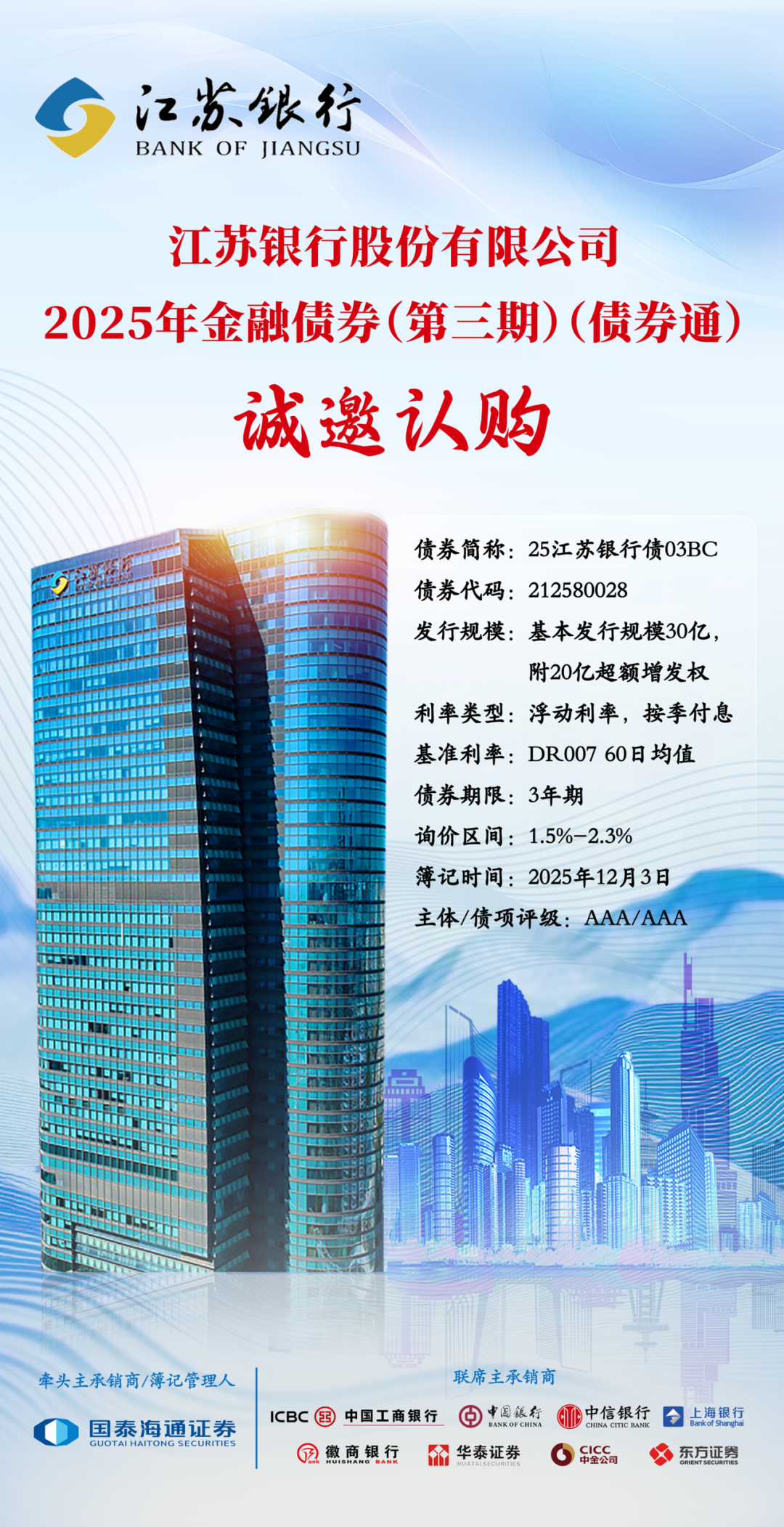 2025年12月3日, 江苏银行股份有限公司 (以下简称“江苏银行”)将在全国银行间债券市场发行2025年金融债券(第三期)(债券通)。