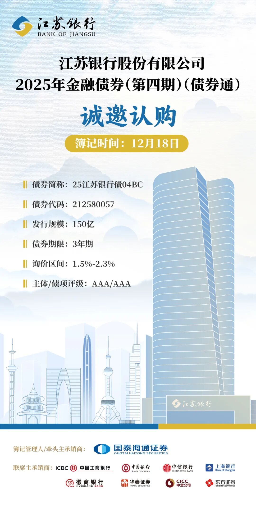 2025年12月18日, 江苏银行股份有限公司 (以下简称“江苏银行”)将在全国银行间债券市场发行2025年金融债券(第四期)(债券通)。