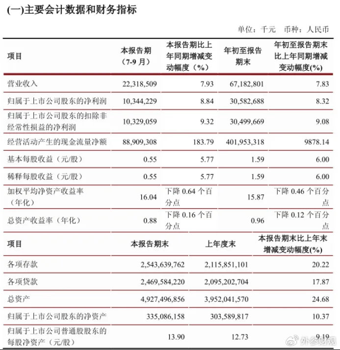 江苏银行归属于母公司股东的净利润为305.83亿元,显示出银行盈利能力的稳步提升。同时,截至三季度末,总资产达到4.93万亿元,各项贷款和各项存款分别增长17.87%和20.22%,可以看护出银行在信贷投放和资金吸收方面的强劲表现。