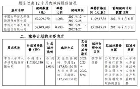 2月21日,杭州银行发布的《5%以下股东减持股份计划公告》显示,杭州银行于2022年2月21日收到股东太平洋人寿发来的《关于减持杭州银行股份计划的函》。太平洋人寿本次减持数量为不超过117850130股,减持比例为1.99%,竞价交易减持期间为2022年2月25日至2022年8月24日。拟减持原因显示:太平洋人寿自身战略安排和资产配置的需要。