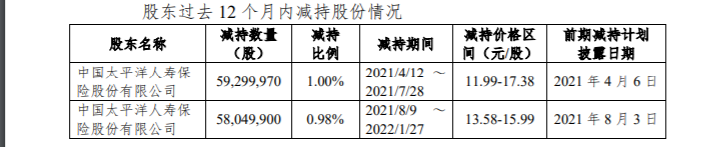 2021年8月9日至2022年1月27日,杭州银行累计遭太平洋人寿减持5804.99万股股份,减持比例为0.98%,价格区间为13.58—15.99元/股,减持结束后太平洋人寿还持有杭州银行1.99%的股份。