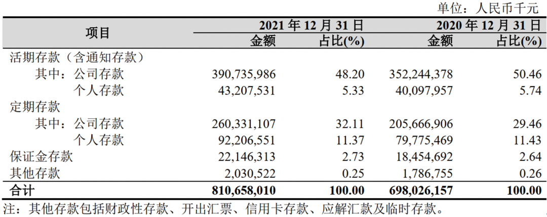 虽然是城商行,杭州银行业务主要还是围绕对公业务,无论是存款还是贷款,该行都以对公为主。其中公司活期存款在存款中占比最高,为48.2%,其次为公司定期存款,占比为32.11%,2021年公司定期存款增幅也最高,同比增长26.58%。